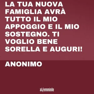 Frasi per una sorella: le dediche più belle per ogni occasione Mar 02, 2020 · Possono essere delle semplici frasi per sorella o degli spunti per una lettera ad una sorella. Le sorelle maggiori sono la gramigna nel prato della vita (Linus) Avere una sorella più grande ci permette di restare bambine per sempre. Mi fiderò come quando io mi lancio e voglio che sia tu a preparare il mio paracadute. (Laura Pausini) Lettere d'amicizia bellissime: tante frasi dedicate agli amici speciali Chi si strattona sempre in qua e in là perché non sa andare dritto. E c'è chi ha il tuo stesso passo. Caterina Bonvicini Gli uomini non hanno più tempo per conoscere nulla. Comperano dai mercati le cose già fatte. Ma siccome non esistono mercanti di amici, gli uomini non hanno amici. Se tu vuoi un amico, addomesticami! Antoine De Saint-Exupéry Come augurare un buon compleanno a una sorella speciale Festeggia il tuo compleanno con la massima felicità! Ti meriti sempre il meglio, sorella. Spero che il tuo compleanno contenga solo ricordi caldi, pieni di amore e di risate. Che possa segnare l'inizio di un anno pieno solo di speranza e di promesse. Buon compleanno sorella! Alla mia dolce sorella, buon compleanno.